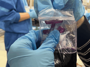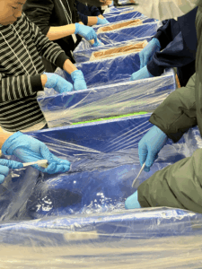 その後は、生徒それぞれが希望する色を使い、ジップロックの中で染料と水を混ぜ、自分のイニシャルを染色する作業を行いました。約30分ほどで色鮮やかに仕上がり、オリジナル作品が完成しました。